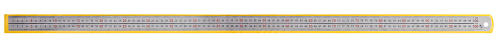 Линейки металлические с глубоко гравированной шкалой, цифры черные, десятки сантиметров выделены красным цветом, начало шкалы с шагом 0,5 мм. Ширина и толщина линеек больше, чем по российским стандартам.
