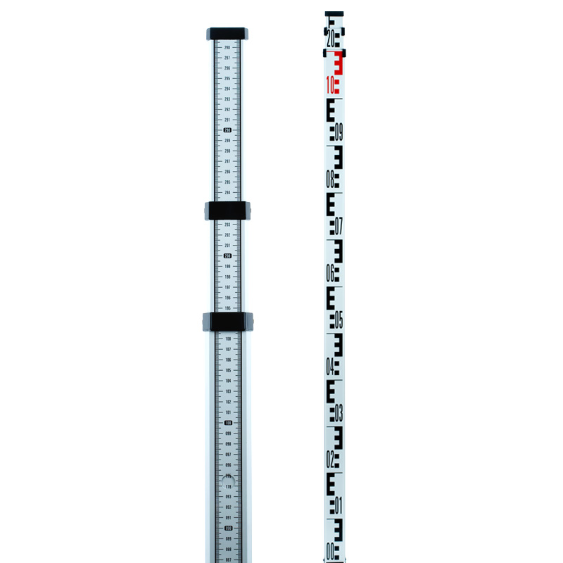 - Шкала "Е" с лицевой стороны красно/черного цвета и миллиметровая шкала с оборотной стороны. Миллиметровая шкала начинает отсчет от нижней части рейки, шкала нанесена на всех 3-х секциях рейки снизу до верху.