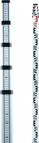 Нивелирная телескопическая рейка ADA STAFF 5 изготовлена из алюминиевого сплава. Профиль оснащен ребрами жесткости, что придает данной рейке дополнительную прочность. Кнопка для фиксации секций рейки металлизированная, стойкая к морозу и служит долгое время. Данная телескопическая рейка на оборотной стороне имеет пять секций, на каждой из которых нанесена миллиметровая шкала снизу до верху. На лицевой стороне расположена шкала «Е», которая обозначена черно/красным цветом. Есть возможность устанавливать дополнительный пузырьковый уровень на пластиковую окантовку в верхний части секции (с креплением типа «уголок») или на профиль рейки (защелкивающийся пластиковый уровень).