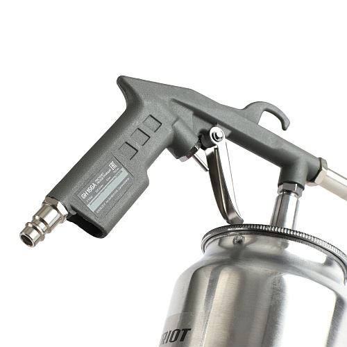 Пескоструйный пистолет Patriot GН 166А обладает большим запасом рабочего ресурса. Длительная работа инструмента возможна благодаря особенностям конструкции и применению современных материалов. Для удобного хранения на верхней части пистолета предусмотрен крючок. Конструкция пистолета обеспечивает защиту от самовоспламенения и взрыва в процессе работы.