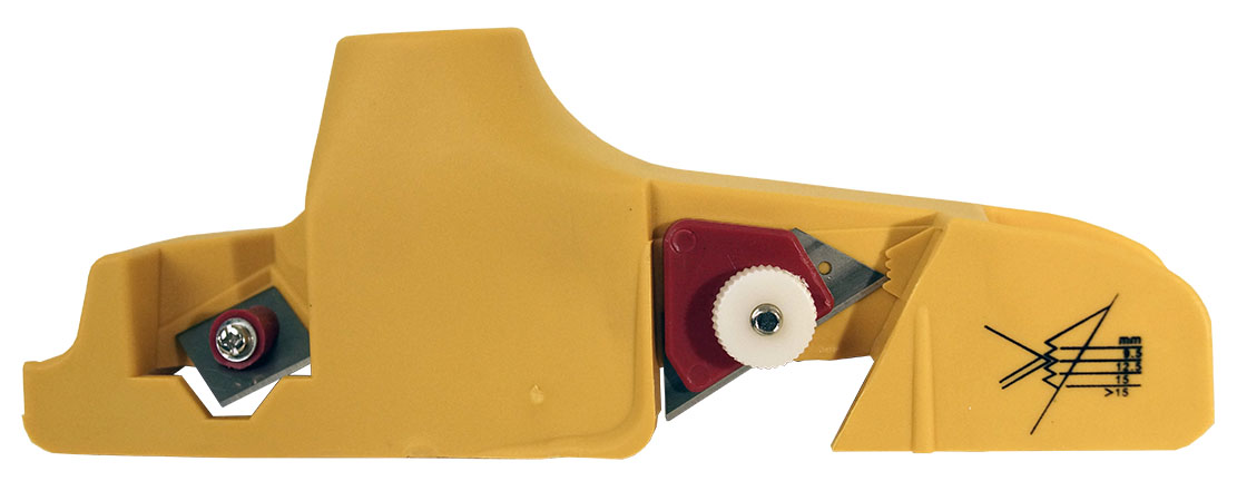 Служит для обработки кромок гипсокартонных плит, корпус из пластика повышенной прочности. Два лезвия из инструментальной стали для обработки кромок под углом 22,5°-45°. Регулировка в зависимости от толщины листа (9,5 мм, 12,5 мм,15 мм и более).