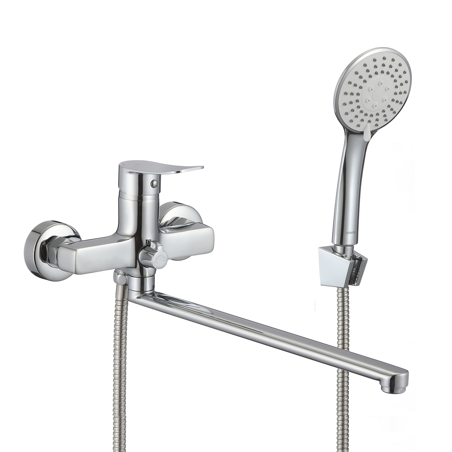 "Смеситель для ванны с длинным изливом (350 мм), однозахватный, латунь, никель-хромовое покрытие, керамический картридж 35 мм, пластиковый аэратор, керамический поворотный дивертор.